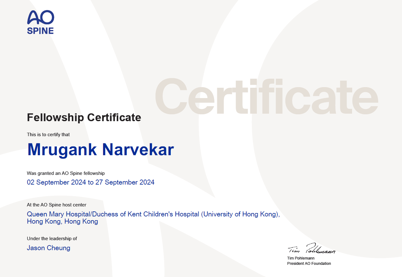 To further enhance his expertise in managing spinal deformities, Dr. Mrugank pursued a fellowship at the department of Orthopaedics and Traumatology, University of Hong Kong through the prestigious AO Spine program.